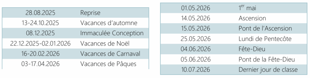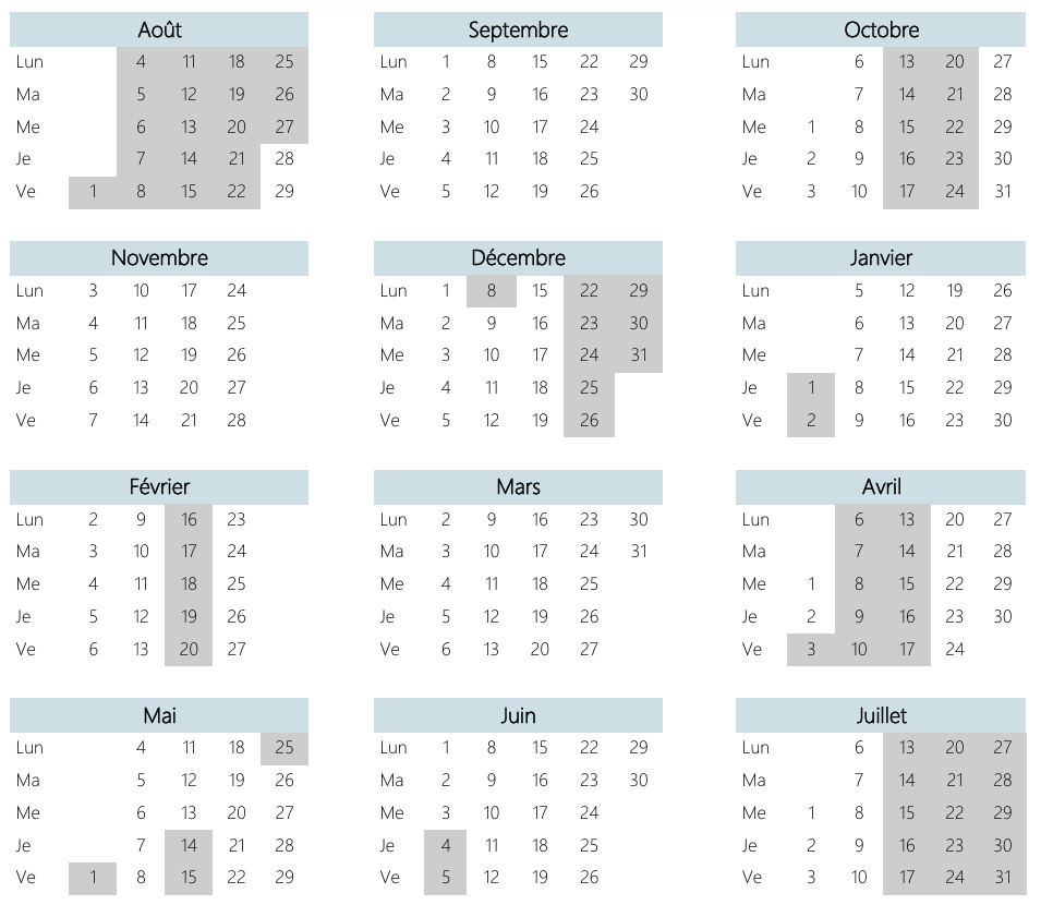 Merci de prévoir les vacances familiales en tenant compte du calendrier scolaire ci-dessous !